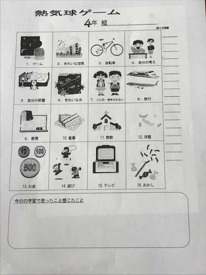 「熱気球に乗って大海原に出かけます。空を飛び続けるためには、ワークシートに書いている荷物を順番に捨てなければいけません。陸地にたどり着いたときに、あなたが最後まで持っているものは何でしょうか?」