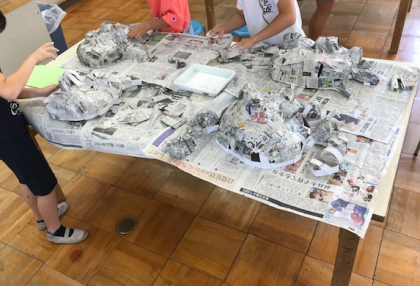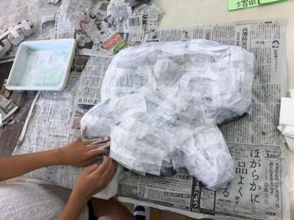 作ったお面の骨組みに、水を溶かしたボンドを使って新聞紙を貼り付けていきました。