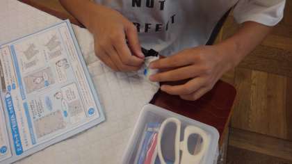 今週からエプロンづくりが始まりました。まずは、布にミシンで縫うための印をつけたり、まちばりでとめたりする下準備を行いました。また、ミシンの下糸をボビンに巻きつける練習をしました。