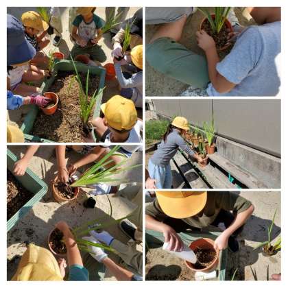 花しょうぶの植え替えを行いました。地域の人に教えていただきながら、上手に植え替えることができました。