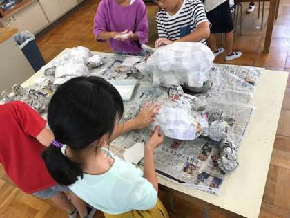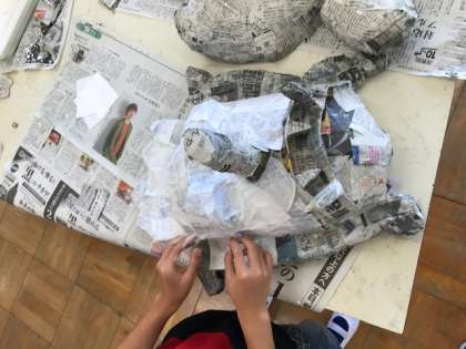 骨組みが完成し、新聞紙で覆う作業になりました。
