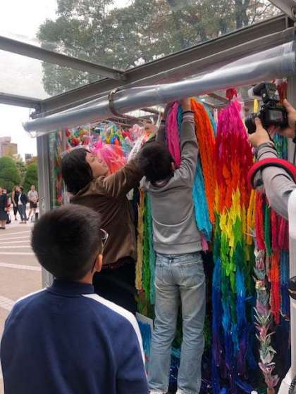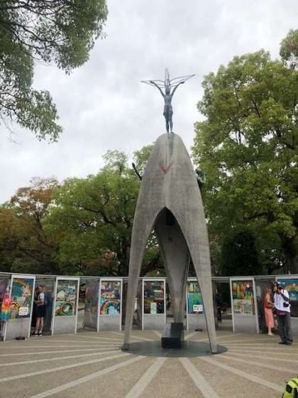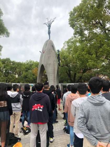 原爆ドームを見学した後、平和の子の像の前で平和集会を行いました。亡くなった方々の魂を慰めるために、全員で黙祷を行いました。