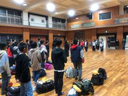 無事に学校に戻ってきました。講堂で帰校式を行いました。