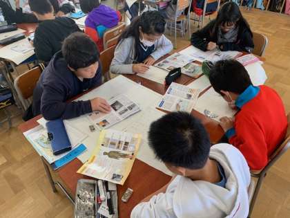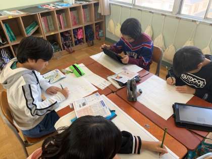 修学旅行で学んだことや感じたことを壁新聞にまとめています。グループごとに、割り付けを考えて記事を書きました。しおりを見返したり、タブレットで調べたりしながら作成しています。完成した新聞は、玄関に掲示する予定です。