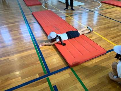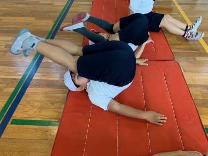 その後、前転(前まわり)と、後転(後ろまわり)に取り組みました。特に後転は手のつき方が難しいようです。何度もついた手で、マットを押しながら立つ自分自身を頭の中でイメージしながら、練習しました。