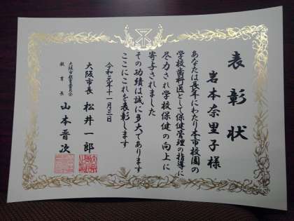 本校の学校歯科医の 岩本 奈里子先生が、城北小学校の学校医として20年勤務され、この度、大阪市より表彰されました。