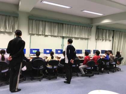 大宮中学校の先生に出前授業に来ていただき、キーボードを見ずにタイピングをする方法を教えていただきました。