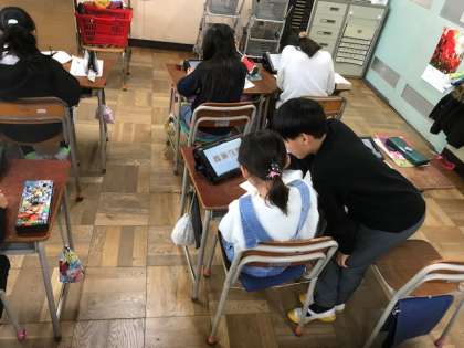 タブレットパソコンを使って、「ごはんとパンの違い」や「お箸とフォークの違い」など、日本と海外の文化の違いについて調べました。歴史や素材、使い方などそれぞれの違いを調べ、ワークシートにまとめていきました。