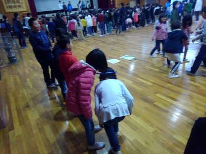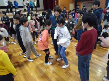 「フラフープ送り」とは違い、次の人の頭が通るための輪っかを作ることが難しくて、どの班も苦戦していました。