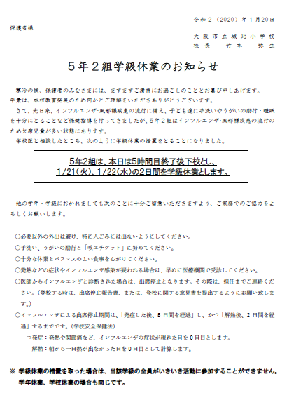 先日来、インフルエンザ、風邪様疾患の流行に備え、子ども達に手洗いやうがいの励行、睡眠を十分にとることなど保健指導を行ってきましたが、5年2組はインフルエンザ、風邪様疾患の流行のため欠席児童が多い状態にあります。学校医と相談したところ、21日(火)22日(水)の2日間、学級休業の措置をとることになりました。