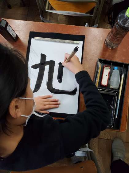 今日の習字では、自分で選んだ一字もしくは二字の漢字を書きました。今までに書いた「土」や「水玉」を通して学んだ「とめ」や「はらい」を活かしたり、漢字に各自の思いをこめて丁寧に書くことができました。