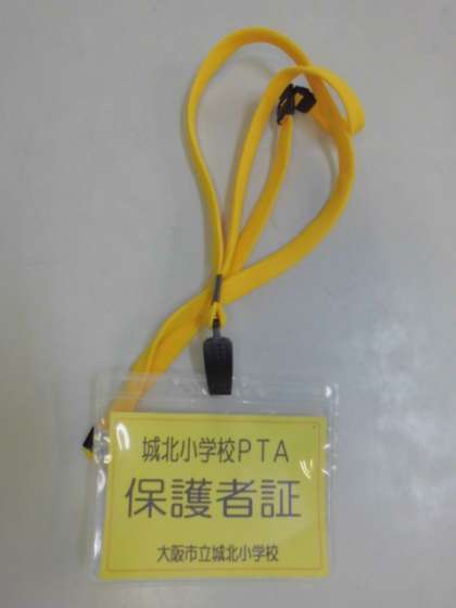 来校されるときは、首にかけてきてください。門を通るときにかけていただいているとスムーズに確認ができます。(お二人以上でお越しの際は、代表の方が保護者証を提示いただければ大丈夫です。)