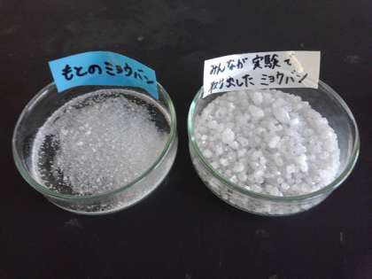 この単元では、水溶液の性質について学習しました。水に溶かしたミョウバンは、水溶液を冷やしたり蒸発させたりして取り出すことができます。