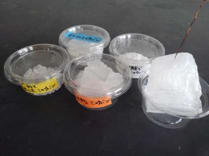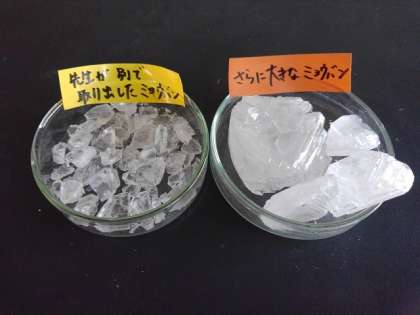 水溶液を冷やす方法で、ミョウバンの大きな結晶をつくりました。とても立派な結晶ができたので、他の学年の児童にも見れるよう職員室前に置いています。