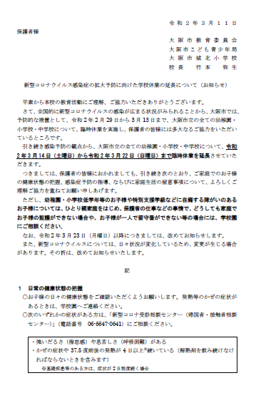 引き続き感染予防の観点から、大阪市立の全ての幼稚園・小学校・中学校について、令和2年3月14日(土曜日)から令和2年3月22日(日曜日)まで臨時休業を延長させていただきます。