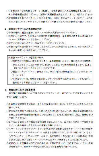 つきましては、保護者の皆様におかれましても、引き続き次のとおり、ご家庭でのお子様の健康状態の把握、感染症予防の指導、ならびに家庭生活の留意事項について、よろしくご理解ご協力を重ねてお願い申しあげます。