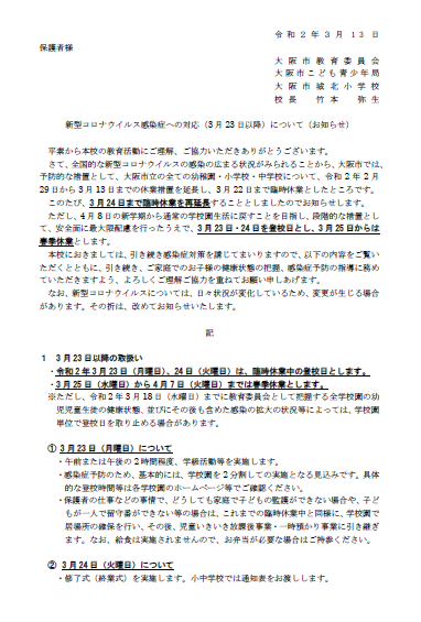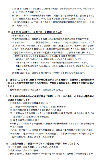 新型コロナウイルス感染症への対応(3月23日以降)お知らせ 3月13日(金)