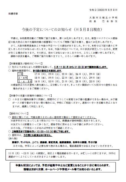 大阪市教育委員会より今後の予定ついての通知がありました。そこで、本校では下記の通りに予定しましたのでお知らせいたします。なお、今後の対応については、日々状況が変化しているため、変更が生じる場合があります。その折は、改めてお知らせいたしますので、よろしくお願い申しあげます。