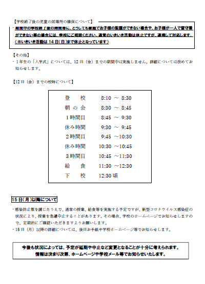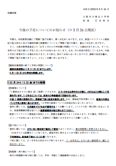 大阪市教育委員会より「6月1日からの学校園の再開について」の通知がありました。そこで、本校では下記の通りに予定しましたのでお知らせいたします。なお、日々状況が変化しているため、今後も予定に変更が生じる場合があります。その折は、改めてお知らせいたしますので、諸般の状況を鑑み、ご理解ご協力を賜りますよう、よろしくお願い申しあげます。