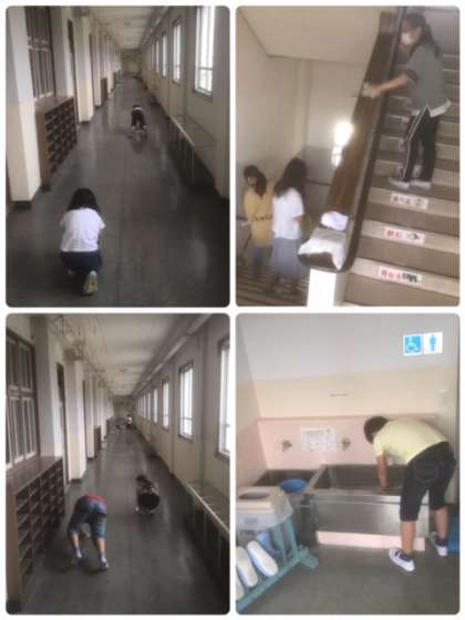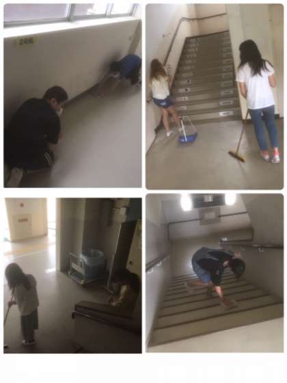 第一回の活動では、あいにくの雨で花壇の整備ができませんでしたので、校内の美化活動を行いました。汚れやすい廊下や階段をピカピカにすることができました。