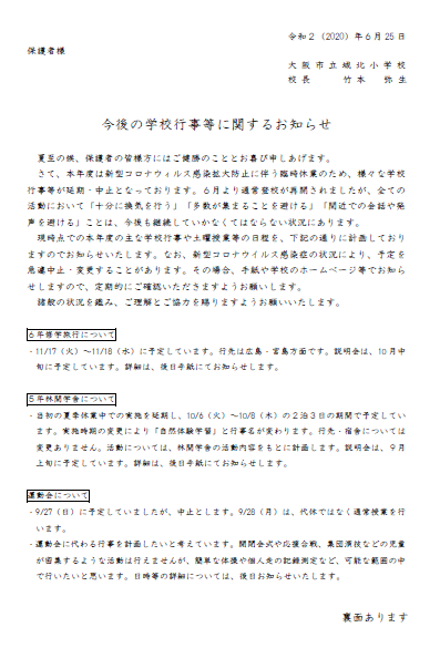 今後の学校行事等に関するお知らせ