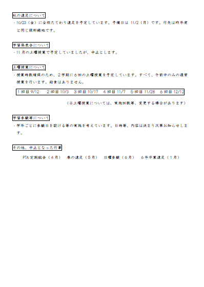 6月より通常登校が再開されましたが、全ての活動において「十分に換気を行う」「多数が集まることを避ける」「間近での会話や発声を避ける」ことは、今後も継続していかなくてはならない状況にあります。現時点での本年度の主な学校行事や土曜授業等の日程を、下記の通りに計画しておりますのでお知らせいたします。