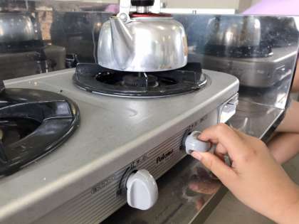 器具栓を開いて実際に火をつけてみると、手慣れた様子で強火→中火→弱火と炎を調節する児童もいれば、恐る恐るといった様子で器具栓に触れる児童もいました。