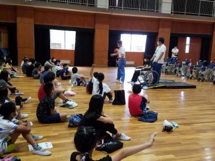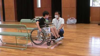 大阪市立心身障がい者リハビリテーションセンターの方にお越しいただき、車いす体験を行いました。自走体験と介助体験をクラス別に同時に実施することで密を防いだり、車いすを毎回消毒したりといった感染防止対策を講じた上での実施となりました。