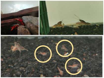 今年はザリガニの赤ちゃんがたくさん生まれています。小さな水槽ではせまそうなので、ザリガニの赤ちゃんをお母さんザリガニと一緒に大きな水槽に移しました。少し前に生まれた先輩の赤ちゃんザリガニと一緒に嬉しそうに泳いでいます。