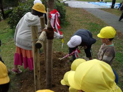 まず、副区長さんや代表の子どもたちのあいさつがありました。その後、6グループに分かれて、ソメイヨシノの苗木に土をかけたり、水をあげたりして、植樹のお手伝いをしました。次に、一人一枚ずつ記念プレートにメッセージを書き、樹木に設置しました。