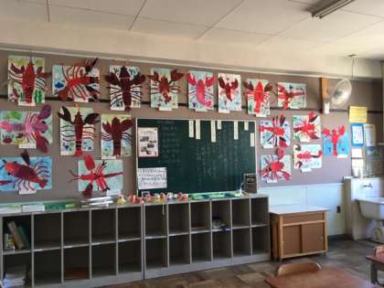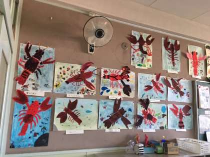 2学期から取り組んでいたザリガニの絵が全員完成し、教室の背面等に飾っています。大きく動きのあるなザリガニたちが、教室の雰囲気をとてもにぎやかにしてくれています。