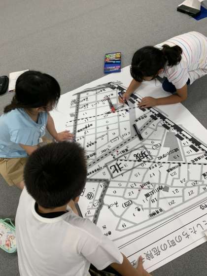 総合的な時間の学習で「防災マップづくり」に取り組んでいます。それぞれの班で、危ない箇所や防災のための機器がある場所などを思い出しながら、今度のフィールドワークに向けて作成しています。