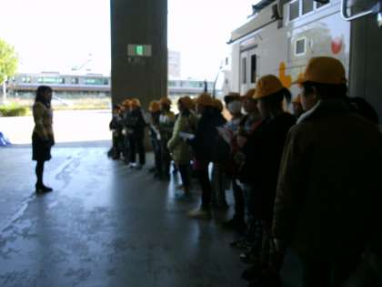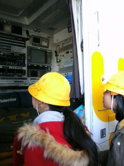 全員入館証を首に下げ、テレビ局内を見学しました。教科書に載っている中継車の実物を見ながら、案内の方の説明を熱心に聞いてメモを取りました。朝の番組で実際に使われているスタジオに入り記念撮影をすることもでき、子どもたちは目を輝かせていました。
