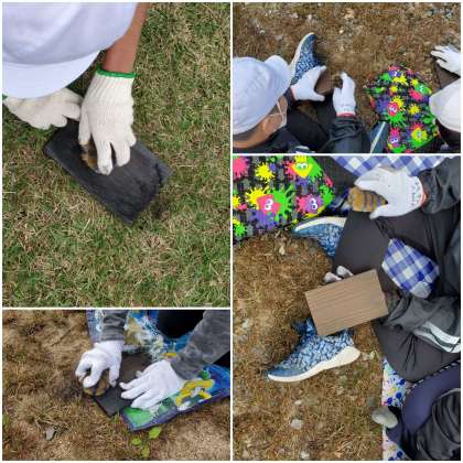 たわしを使って黒い板を磨いています。きれいに煤(すす)を落としていきます。
