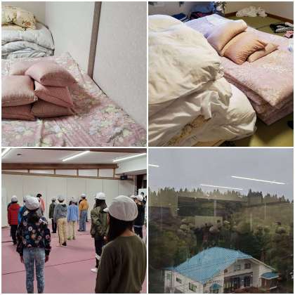 雨のため、朝の集いは宿舎内で行っています。児童のあいさつ、体操、先生からの話を聞きます。その後は、朝食の時間まで布団の整理をします。
