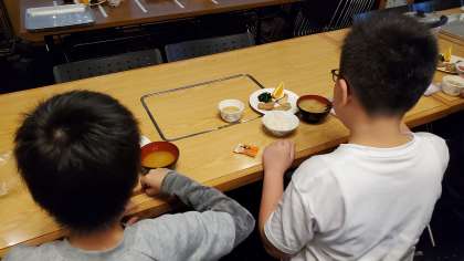 全員そろっていただきます。昨日は早めの就寝だったので、体力もしっかり回復し、元気に朝ごはんを食べています。