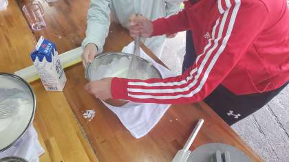 ホイップと砂糖を混ぜて生クリームを作ります。ツノが立つまで、みんなで協力しながら泡立てます。