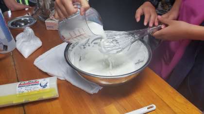 少し肌寒いですが、一生懸命混ぜた後は、体も少し温まりました。次は、できた生クリームと牛乳を合わせます。