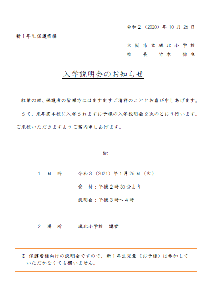 令和3年1月26日(火)に、来年度、城北小に入学する児童がいるご家庭を対象とした新1年生入学説明会を行います。