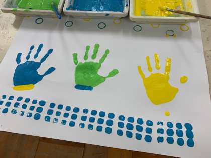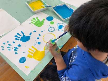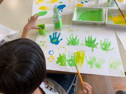 1年生になって初めて絵の具を使った学習をしました。ゼリーの容器やペットボトルなどに絵の具を付けて、どんな形が写るのかなとわくわくしながらスタンプしました。「これは魚!」「これはお花に見える!」とスタンプしたものから、どんどんイメージが膨らんでいました。