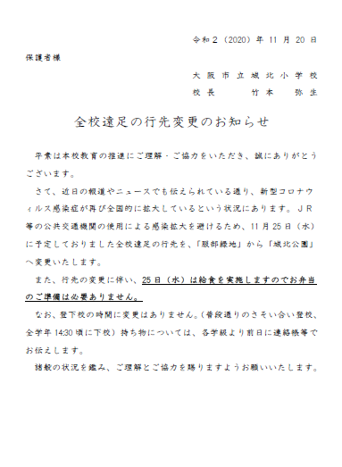 近日の報道やニュースでも伝えられている通り、新型コロナウィルス感染症が再び全国的に拡大しているという状況にあります。JR等の公共交通機関の使用による感染拡大を避けるため、11月25日(水)に予定しておりました全校遠足の行先を、「服部緑地」から「城北公園」へ変更いたします。