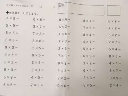 算数では、毎日かけ算のテストをしています。九九を覚えてきて、どんどん計算するのが早くなってきています。自分の最高得点を目指して、頑張っています。