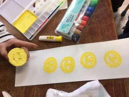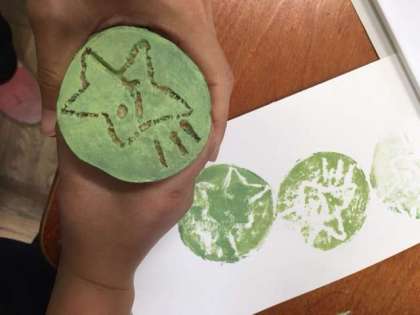 学習園で育てたさつまいもで、いもばんを作りました。自分の名前やマークを爪楊枝でほるのに苦戦しましたが、「けっこうきれいにできた!」「めっちゃ楽しい!」と言っていました。手作りのかわいいハンコができました。