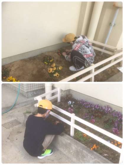 寒くなり、2学期には綺麗に咲いていた花も少しずつ枯れてきました。そこで、今日は古い枯れかけた花を摘み取り、新芽を残すという作業をしました。