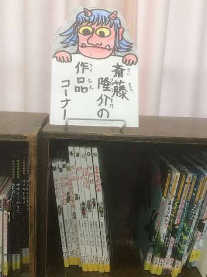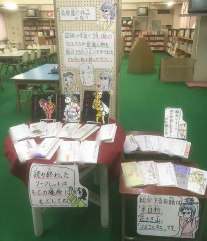 3年生の児童が国語の授業で学習した「半日村」「花さき山」「ソメコとオニ」の登場人物を紹介するリーフレットを、図書室に展示しました。