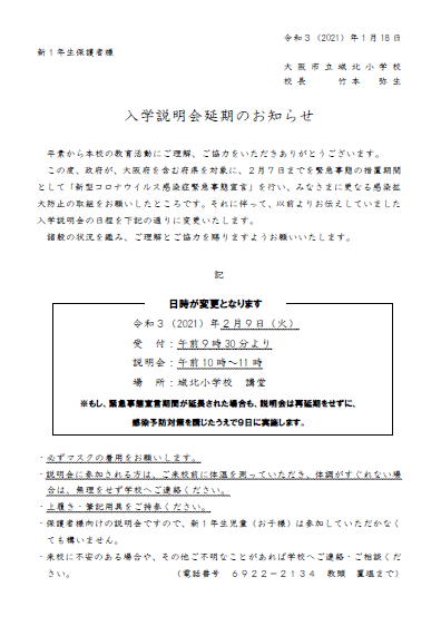以前よりお伝えしていました入学説明会の日程を下記の通りに変更いたします。新1年生の各ご家庭には、先日郵送でお手紙を送付しています。手紙の内容をご確認いただき、来校に不安のある場合や、その他ご不明なことがあれば学校へご連絡・ご相談ください。