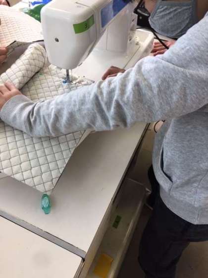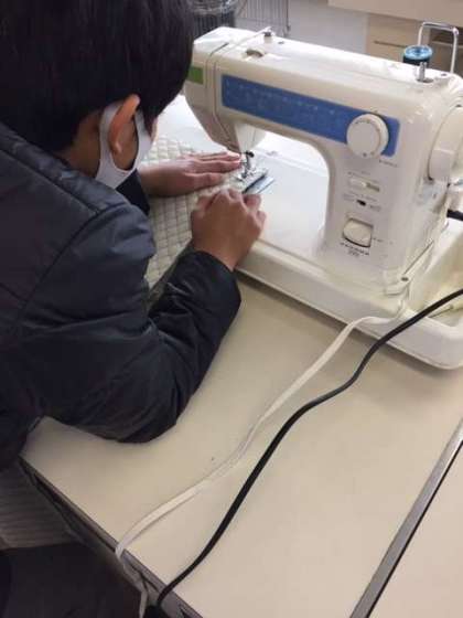 家庭科の学習で、防災ずきんを作成しています。完成した防災ずきんは、卒業時に1年生にプレゼントします。心を込めて作成しているので、楽しみにしていてください。
