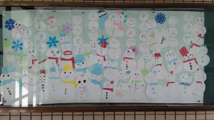 図画工作科では、自分たちで画用紙を切って、雪だるまを作りました。マフラーやぼうしも色画用紙で作って、おしゃれにしています。