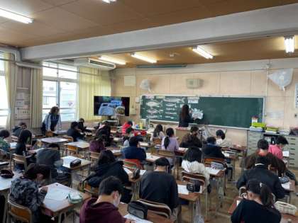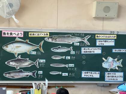 給食で出る魚について学習をしました。切り身や加工食品となって給食で食べられている魚たちにはどんな種類があるのか、また、魚を食べるとどんないいことがあるのかを学習しました。実際の魚の大きさや姿を見て、子どもたちは驚いていました。