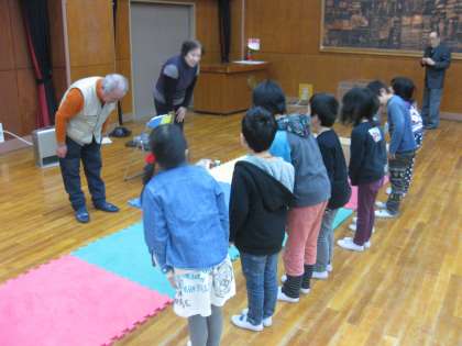 今日は、城北老人クラブ連合会の方々にお越しいただき「ふれあい昔遊び交流会」を実施しました。この日に向けて、老人会の方々は「子どもたちを喜ばせてあげよう」と、実に様々なご準備を進めてくださっていました。手作りのお手玉や、各種あそび用具の準備はもちろん、何回も打ち合わせをする場をもち、本番の今日を迎えるに至りました。
